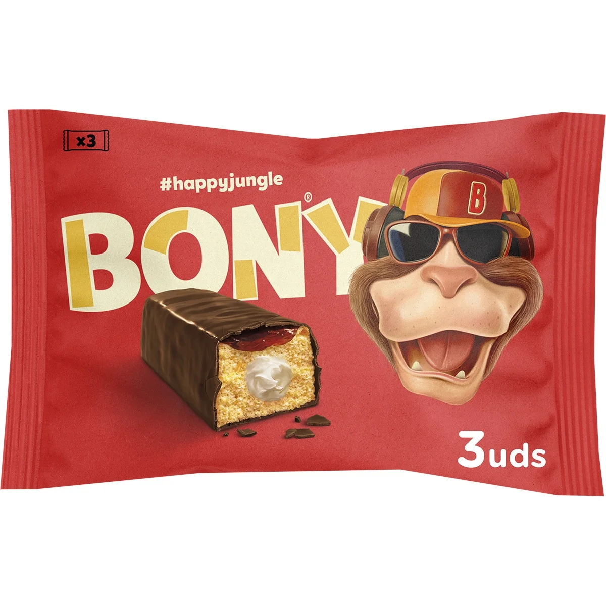 - Azúcar, grasas vegetales (palmiste, palma, coco) agua, harina de trigo, huevo líquido pasteurizado, cacao desgrasado en polvo (4,2%), humectantes (E 422, E 420), pulpa de fruta (3,3%), (fresa, melocotón, manzana, naranja), almidón de maíz, jarabe de glucosa, aceite vegetal (girasol), dextrosa, aromas, emulgentes (lecitina de girasol, E 471, E 435, E 476, E 402, E 401), gasificantes (E 450, E 500), jarabe de glucosa y fructosa, harina de arroz, almidón modificado de maíz, leche desnatada en polvo, sal, estabilizantes (E 407, E 410), conservadores (E-200, E 202), acidulante (E 330), colorante (E 120). Puede contener frutos de cáscara (avellana).